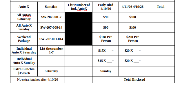 For two or three driver cars: Please register one driver. In the Comments about Registration, please state that you are a two driver car and who the other driver is. This is important for gridding purposes.